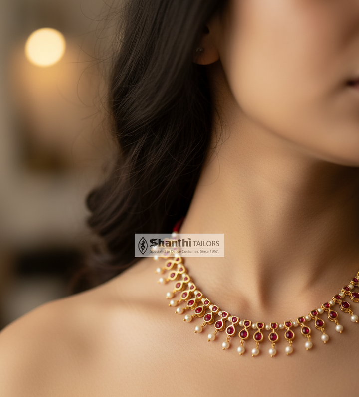 Elevate your dance attire with our exquisite 2 Stone Choker, meticulously crafted by Shanthi Tailors. This stunning necklace, a masterpiece of original temple jewellery, is not just an accessory; it’s a celebration of tradition and artistry, deeply rooted in the cultural heritage of Bharatanatyam.