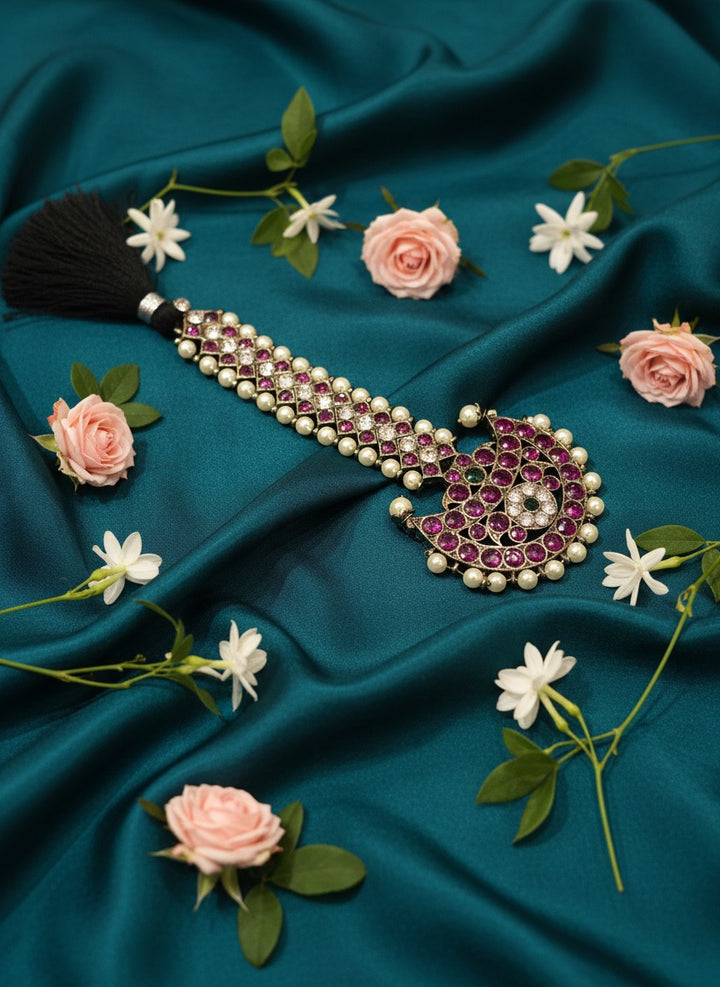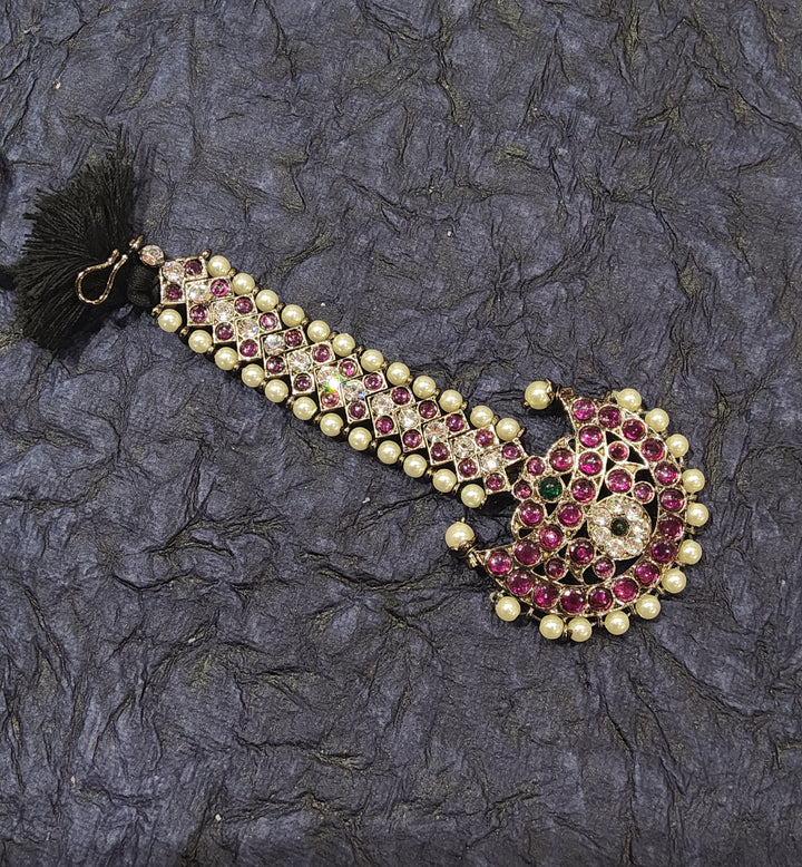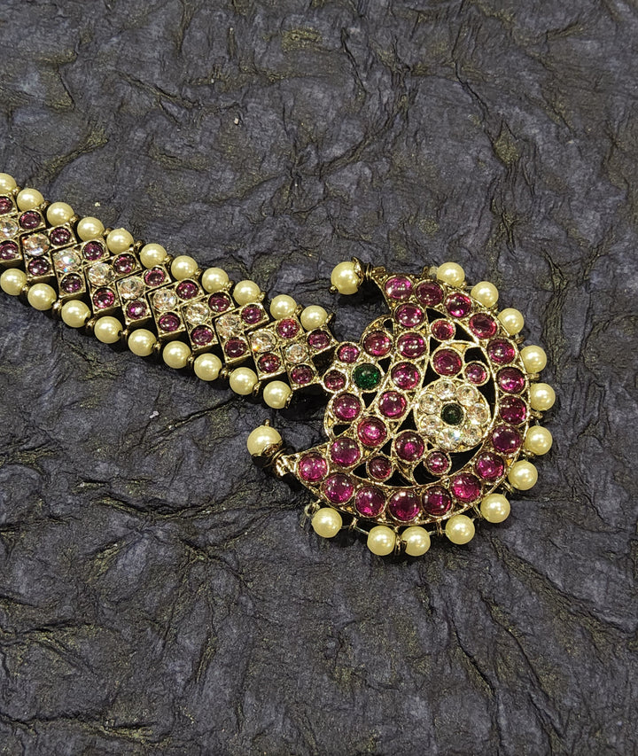 Add a bold and divine touch to your professional classical dance look with this beautiful V Moon Chutti – Black Series, crafted in premium Copper Jewellery. Designed with a deep black base enhanced by ruby pink stones, pearl edging, and temple-style detailing, this Chutti gives dancers a dramatic and expressive forehead highlight.