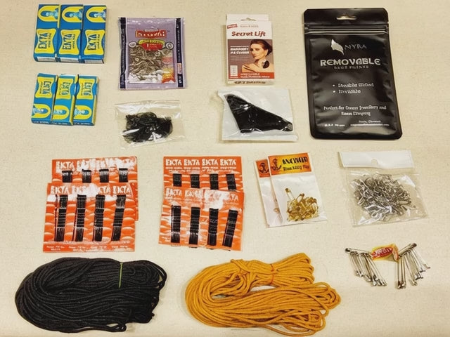 This Essential Kit is meticulously curated for Bharatanatyam dancers to help secure costumes, hair, and jewelry flawlessly during performances. The kit includes the following items: