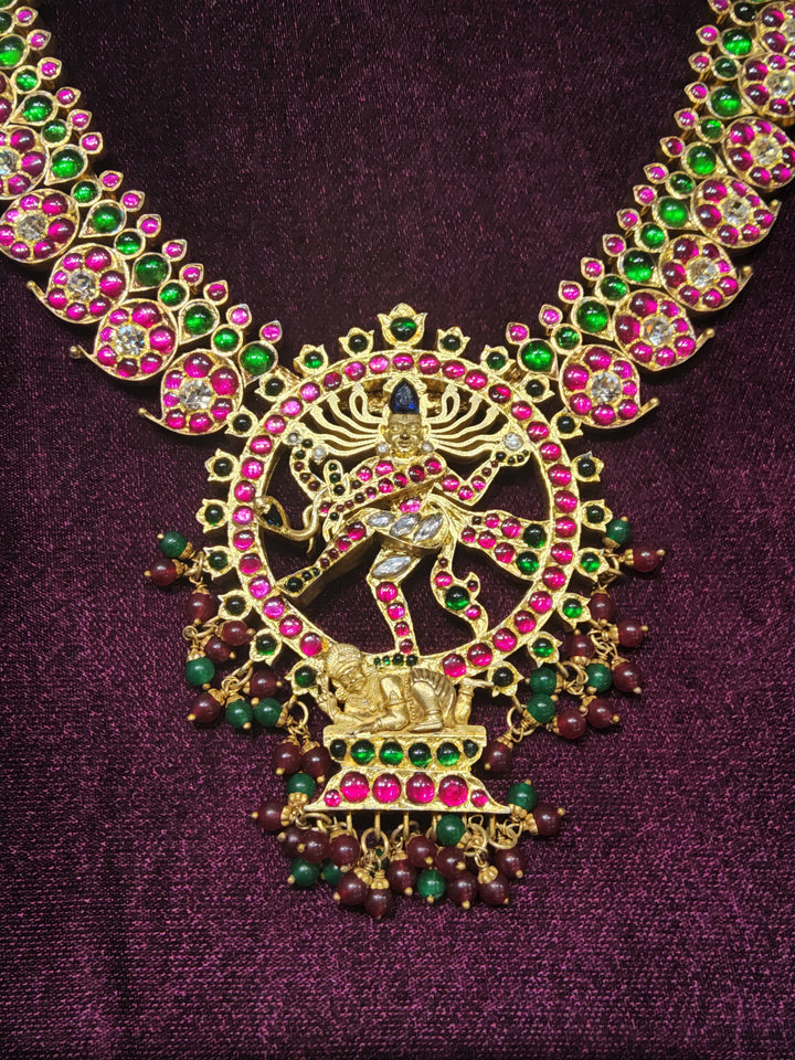 The centrepiece features the Nataraja, the cosmic dancer, representing rhythm, grace and spiritual energy — making this haram especially meaningful for Bharatanatyam and Kuchipudi performers. The mango motifs along the chain enhance the richness and classical beauty, giving dancers a bold and majestic stage presence.