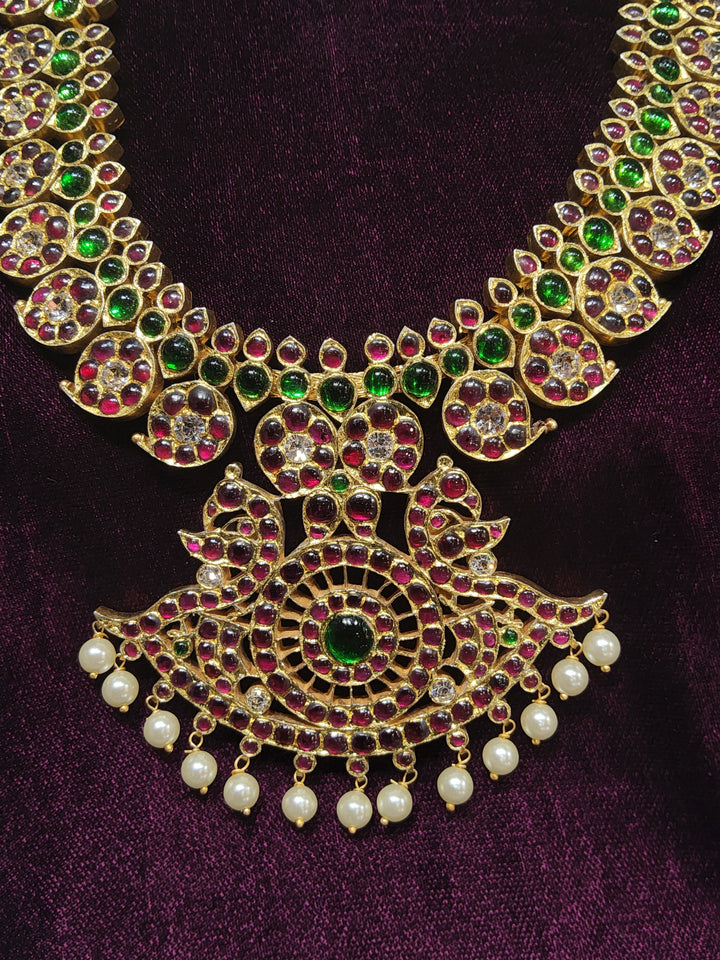 The big pendant enhances abhinaya, neckline framing, and overall classical silhouette. Completely handcrafted by skilled temple jewellery artisans, this long haram is durable, comfortable, and designed to shine under stage lighting.