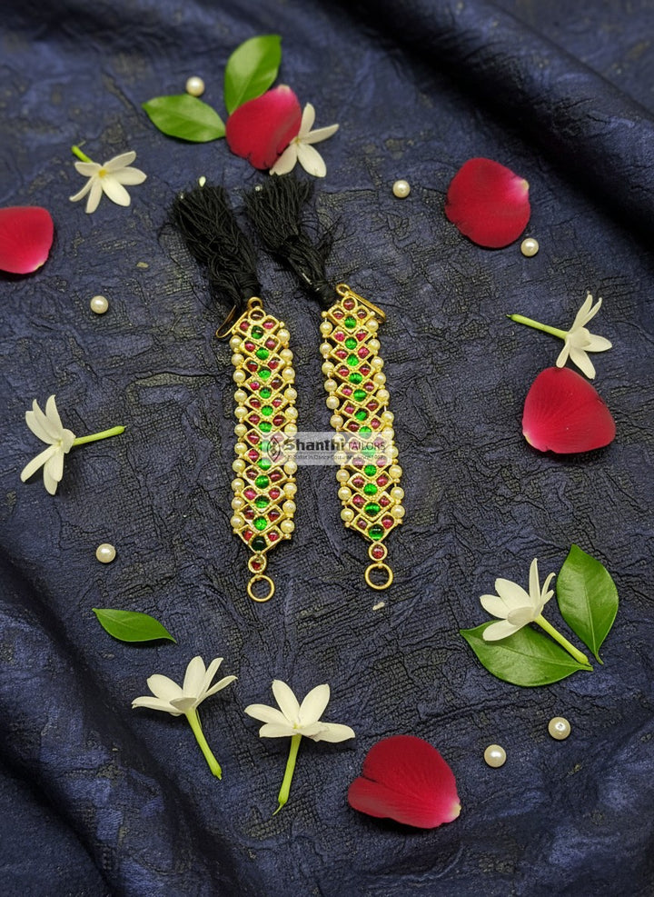 The stunning V-shape design, set with rich ruby stones and bordered with traditional pearls, drapes gracefully from the ear to the hair, offering both beauty and stability. This mattal is an essential accessory for Bharathanatyam, Kuchipuddi, Arangetram, Margazhi concerts, and all Indian traditional dance performances.