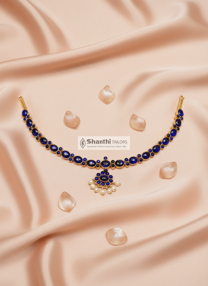 Set with deep blue stones in traditional temple layout, this choker sits close to the neck and enhances posture, presence and abhinaya clarity on stage.